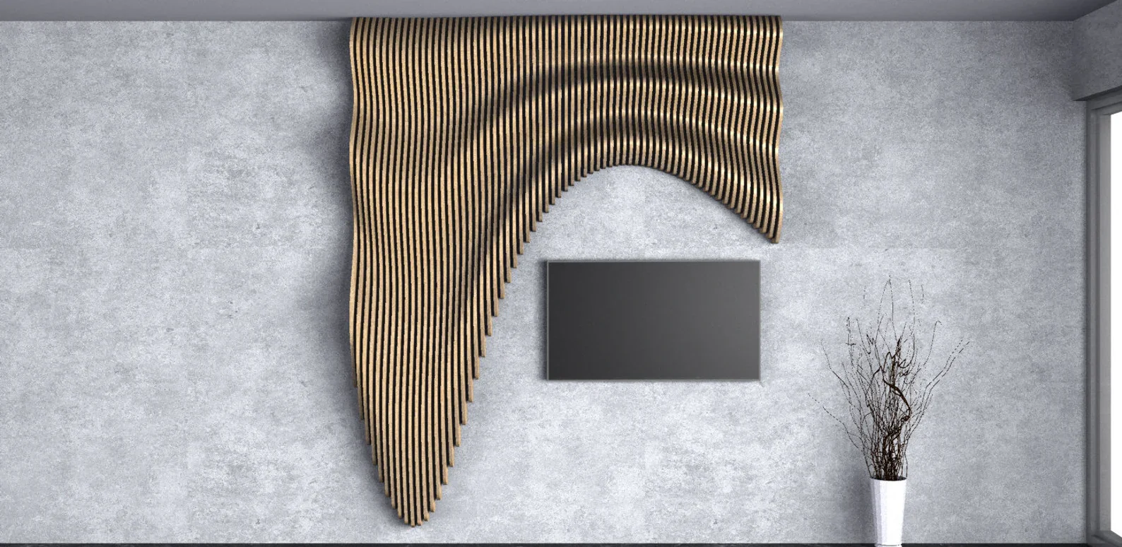 This beautiful parametric wave wall panel is made from 67 individual wood pieces. Each cut on our CNC router, hand finished and sprayed with a protective satin clear coating. Place above your TV or other wall mounted feature. Or just use it as a wonderful piece of art to add decor to your room. Businesses, homes, lounges and reception areas are all suitable places for this piece.